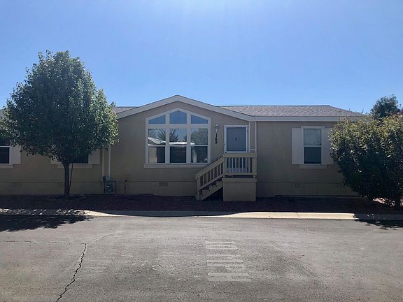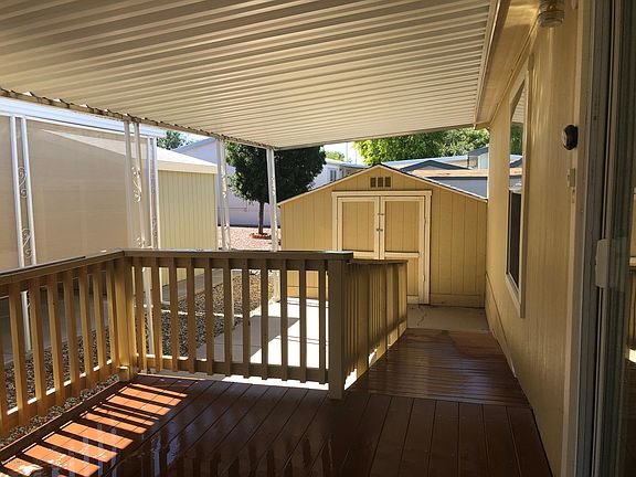 This lovely home is situated on a corner lot and centrally located in beautiful Chino Valley. The home is located in a beautiful 55+ mobile home park on leased land. This 3 bedroom 2 bath home is spacious and offers plenty of light through the large front windows and the skylight. The interior has been freshly painted, the master bedroom has an attached sitting room, and a large laundry room with space for a freezer. It has a deck, a storage shed, and low maintenance landscaping. This home is priced to sell!!!