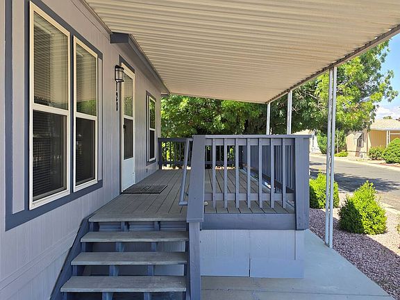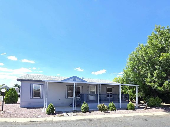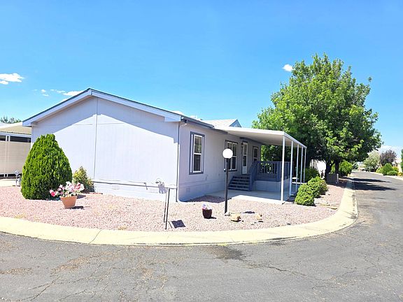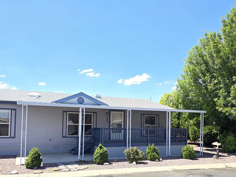 Welcome to comfortable, carefree living in the heart of Chino Valley! Located in a highly sought-after senior mobile home park just minutes from shopping, medical services, and dining, this beautifully maintained 3 bedroom, 2 bathroom home sits on a premium corner lot and offers both space and serenity. Enjoy your morning coffee on the large, covered front porch or take advantage of the back door ramp for easy accessibility. The home features mature landscaping, a spacious shed for extra storage, and a 2-car covered carport with shade screens to keep your vehicles protected year-round. Inside, you'll find laminate wood flooring throughout, adding warmth and style to the open floor plan. The kitchen is equipped with new stainless steel appliances. The master suite includes a walk-in closet and a generous bathroom with ample linen storage, and a walk-in shower for added convenience. Don't miss this opportunity to live in one of Chino Valley's most desirable 55+ communities-schedule your showing today!
