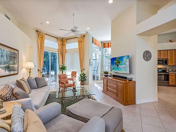 Welcome to your own private pool dream home in award-winning gated Fiddler's Creek! This immaculately maintained residence offers two bedrooms plus a study that could act as a third bedroom, two full baths, an air-conditioned two-car garage and eastern lake views. Updates in 2019 include a new tile roof and new picture-frame screen enclosure. Step inside to discover a beautifully furnished interior, complemented by impressive volume ceilings, large transom windows supplying plentiful natural light, and tile flooring throughout. The kitchen features stainless steel appliances and a pantry. The study, with its French doors, provides a versatile space for an office, library, media room, or third bedroom. Retreat to the owner's suite, a haven for relaxation, complete with two closets and spa-like en-suite bathroom with dual sinks, makeup vanity, private water closet, walk-in shower and soaking tub. New Maytag washer in 2020 and new AC in 2018. Additional features include a sink in the laundry room and a paver driveway and walkway. Residents enjoy lush landscaping, state-of-the-art fitness center with an extensive class schedule, tennis and pickleball with clinics, leagues and lessons, bocce, spa services, hot tub, sauna, steam room, pilates, fine and casual pool-side dining, a resort-style pool with waterfalls and slides, and an extensive activity and event calendar with activities, events and parties of all types for all ages and interests. Optional golf, beach, and marina memberships available. Plenty of space for bicycling, running, walking and dog-walking. Outstanding location convenient to all Naples and Marco Island attractions including boutiques, art galleries, parks, executive airport, museums, boating and yacht clubs, indoor/outdoor dining with both fine and casual options. This is your opportunity to live the lifestyle that you have worked so hard to attain.