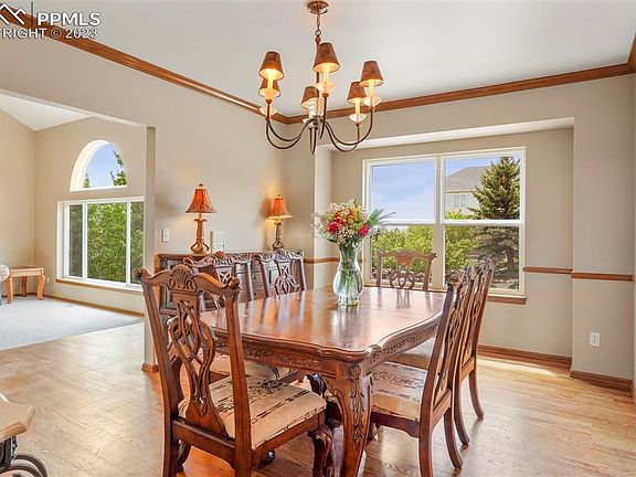 Welcome home, this one-of-a-kind gem is nestled on a peaceful cul-de-sac, ensuring your privacy and tranquility. Boasting remarkable views that are truly unparalleled, this residence is a nature lover's dream. A gorgeous wall of windows invite natural light to flood the interior while framing the picturesque views of the Air Force Academy Open Space. Soaring vaulted ceilings create an airy ambiance, and the tasteful use of brick surround the fireplace adds warmth and character. This home offers 5 generously sized bedrooms, ensuring comfort for all occupants while the owner’s suite is a true haven, featuring a spacious (13x12) five-piece bath with elegant French doors, a walk-in closet, and a cozy fireplace, offering a private oasis to unwind. The formal dining and living areas provide elegant spaces for hosting gatherings and creating lasting memories. The walkout basement leads to a nearly half-acre lot, providing endless possibilities for outdoor enjoyment and relaxation. Don't miss the opportunity to experience the extraordinary lifestyle offered by this residence in Talon Ridge at the top of Peregrine. Schedule a showing today and discover the epitome of luxury living in a truly unbeatable location. Square footage to be verified by buyers.