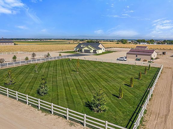 Custom-built country home on 10 acres just a few miles from Lake Lowell with a workshop, large animal barn, fenced horse arena, and 5 acres of active farmland. This rural estate is perfect for the hobby farmer or horse lover.LandThe acreage features an impressive 40 x 40ft workshop with power that has one bay walled in making it an ideal workspace, gym, or office. The workshop also would be a great place to park an RV or farm equipment. Horse lovers will enjoy the 36 x 36ft large animal barn, a fenced horse arena, and 2 pastures. For smaller livestock, there is a goat pen with a new shed and a chicken coop with a shaded run. Gardeners will appreciate the large 18 x 12ft greenhouse with accessibilityto water and power. The greenhouse is constructed with raised white cedar, two doors, and 5 ventilation windows. Next to the greenhouse is additional gardening space that is both raised and unraised for planting more vegetables or flowers. 5 acres of the property is active farmland that is leased out to a tenant farmer. The owners of this country estate have meticulously planned the landscaping for the property. In front of the house is an irrigated park with vinyl fencing and a variety of shade and fruit trees. The park has been planted with arborvitaes, Austrian pines, Green Hurst Sentry centerpiece tree, Magnolia tree, Flowering Lotus tree, Mulberry tree, Vanderwolf pine, apple trees, and peach trees. Also on the grounds is a pear tree near the house and the private asphalt driveway that is lined with alternating purple and white blossoming crab apple trees. All of this lovely greenery is on a sprinkler system. 10.04 Deeded Acres 5.00 Acres of Leased Farm Land with Pressurized Irrigation 1000 Gallon Buried Propane Tank Beautiful Landscaping Chicken Coop Fenced Park Fruit Trees Garden Area Goat Pen with Shed Greenhouse Irrigation Large Animal Barn Level Topography Livestock Fencing Private Paved Driveway Sprinkler System Workshop with Power ImprovementsThe relaxing country atmosphere continues into the interior which showcases an open living concept blending the living room, kitchen, dining room, and lounge areas. There are modern design finishes throughout such as custom blinds, granite kitchen counters, dark wood cabinets, a custom-designed fireplace, arched walkways, vaulted ceilings, and laminate wood flooring. The primary suite showcases a dual vanity, a large walk-in closet, a walk-in shower, and private access to the covered patio with a NEW Elite Jacuzzi. The backyard is set up with a full-length back patio, a covered patio area in the center, and propane for a future pool. The attached 3-car garage has plenty of space to park your vehicles. The 3rd bay has been split off and is used as a cooled pantry area. 2,616 sq ft 4 Bedrooms 2.5 Bathrooms 3 Bay Attached Garage with Cooled Pantry Area Built in 2021 Breakfast Bar Covered Front Porch Covered Patio with Sunshade Custom Blinds Elite Jacuzzi Tub (NEW) Fireplace (Custom Designed) Generac Generator 22KW on Propane Granite Kitchen Counters Handicap Accessible Individual Well Office with French Doors Pantry Primary Suite with Walk-In Closet Rain Gutter (Fully) RV Parking Security System Septic System Setup for Future Pool Stainless Steel Appliances Title Entry Water Filtration System Vaulted Ceilings RecreationIf you like to relax by fishing, there are opportunities to cast your fishing pole in the Snake River at Marsing Pond or at the nearby Wilson Springs Ponds. Both ponds are known for producing rainbow trout or largemouth bass. Additional fishing and recreational opportunities are available at Celebration Park and Swan Falls Dam which is south of the property. 2.2 miles from Lake Lowell 6.5 miles from Wilson Spring Ponds 8.6 miles from Indian Creek Winery 11.3 miles from the Snake River 11.6 miles from St. ChappelleWinery 13.6 miles from Deer Flat National Wildlife Refuge 19.1 miles from Celebration Park 21.8 miles from Jump Creek Falls 22.5 miles from Givens Hot Springs 31.3 miles from Morley Nelson Snake River Birds of Prey 31.4 miles from Swan Falls Dam Water/Mineral Rights & Natural ResourcesThe land includes 9.37 acres of irrigation rights through the Boise Kuna Irrigation District so almost the entire property has access to irrigation. The 2022 irrigation cost was $542.38. LocationShopping, hospital facilities, and entertainment are just a mere 20 minutes away in either direction to Nampa, Idaho, or Kuna, Idaho. The property is nestled between the beautiful shores of Lake Lowell and the agricultural country of south Canyon County. Lake Lowell Reservoir is just 2.2 miles away and is a popular venue for enjoying swimming, boating, fishing, and hiking. There are also two public parks along the lake where residents can gather for barbecues or picnics. Lake Lowell Park is located on the upper dam and includes a disc golf course. The park on the lower dam is part of the Deer Flat National Wildlife Refuge, so it is a great site for bird-watching. East of Lake Lowell is Idaho's wine and orchard country. Some of Idaho's finest wines are produced in the lush vineyards of Canyon County at wineries such as Ste. Chapelle Winery, Bitner Vineyards, and Hells Canyon Winery.