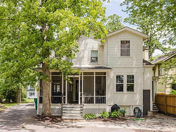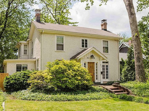 Charming two-story century home in Webster Groves featuring four bedrooms and two bathrooms. The exterior boasts the quintessential Webster Groves home with a welcoming front porch. The well-maintained front yard includes mature trees and bushes, providing serene atmosphere.