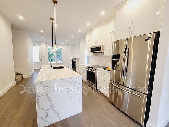 Beautiful Main Floor Unit in Bonnie Doon for Rent Discover this exquisite main floor unit located in the highly sought-after Bonnie Doon neighborhood. This home features 3 bedrooms and 2.5 baths, offering ample space and modern amenities for comfortable living. The open-concept floor plan is enhanced by engineered hardwood flooring and impressive 9ft ceilings, creating a spacious and inviting atmosphere. The kitchen is a culinary dream, boasting white modern cabinets, quartz countertops, and a waterfall edge on a large island. Matching stainless steel appliances add both style and functionality. Adjacent to the kitchen, the cozy living room is centered around a gas fireplace with built-in shelving, perfect for relaxation and entertainment. The unit also includes a convenient half bath and large entryways at both the front and back, providing plenty of storage space. Upstairs, you'll find three well-appointed bedrooms. The primary bedroom features a luxurious walk-in closet and an ensuite bathroom with a glass walk-in shower. Two additional bedrooms share a second full bath. The laundry facilities are also located on the upper floor, offering added convenience. Outdoor living is made enjoyable with a large deck and a landscaped backyard, ideal for gatherings and leisure activities. The home also includes a double detached garage. This pet-friendly property welcomes your furry friends, subject to approval and a monthly pet fee. Living in Bonnie Doon offers numerous benefits, including proximity to schools, parks, shopping centers, and excellent public transportation options. This vibrant community provides a perfect blend of urban conveniences and serene living. A flat monthly rate of $400 covers all utilities, simplifying your budgeting. Don't miss the opportunity to make this exceptional property your new home. Contact us today to schedule a viewing and experience the best of Bonnie Doon living.