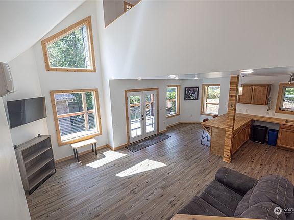Escape to an affordable haven of comfort in this custom 2 Bed/1.75 Bath retreat! With an open floor plan, vaulted ceilings, and vinyl plank flooring throughout, the home boasts modern elegance. Relax on the spacious wrap-around covered deck, and utilize two outbuildings for storage or hobbies. Abundant windows invite natural light, creating a serene ambiance. No HOA restrictions grant you freedom. Only 15 mins from Silver Lake and 30 mins from Mt. Baker's thrilling skiing, snowboarding, and hiking. Your dream mountain getaway awaits!