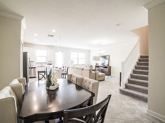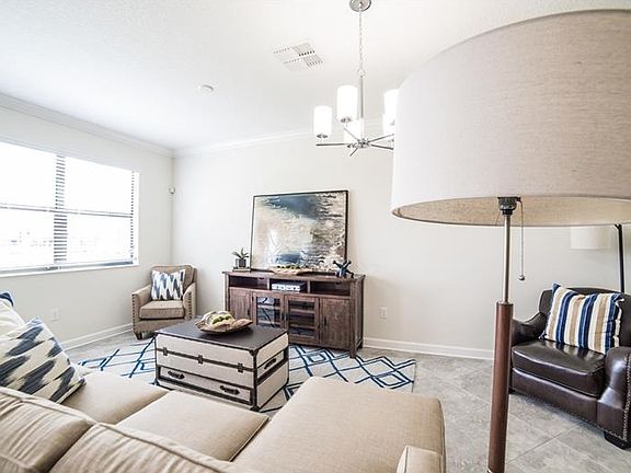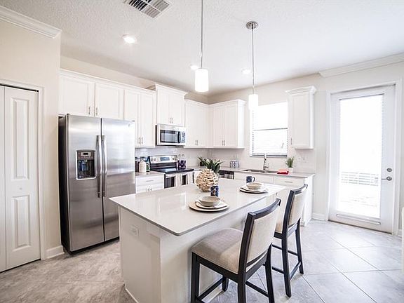 Don't miss the chance to be the first family to live in this gorgeous new construction townhome in Champions Gate! You have plenty of space with 4 bedrooms and 3 and 1/2 bathrooms. It's packed with upgrades including, paver drives, Taexx Pest Control Pre-Installed, solid steel, raised-panel carriage style garage doors, 2" designer blinds, GE® washer and dryer included and Touch screen deadbolt at entry. That's not all! The designer kitchen has GE Stainless Steel appliances, luxury 42" multi-leveled, maple wood cabinets with crown molding, chrome cabinet hardware quartz countertops, stainless steel under-mount kitchen sink, full decorative backsplash, and designer faucet. Your flooring includes tile in all wet and common areas and Mohawk® green certified, plush, wall-to-wall, upgraded carpeting in all bedrooms. The master suite comes complete with maple wood cabinets, designer chrome plumbing fixtures, quartz countertops, garden tub, separate shower and dual sinks. The community also features a swimming pool, club house, fitness center, fully maintained lawns, gated entrance, and golf course. All conveniently located close to shopping, restaurants and the attractions! Schedule your showing today!