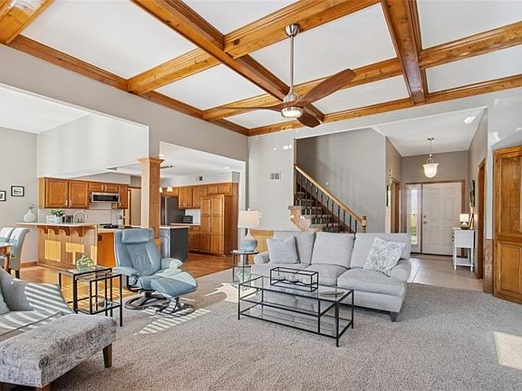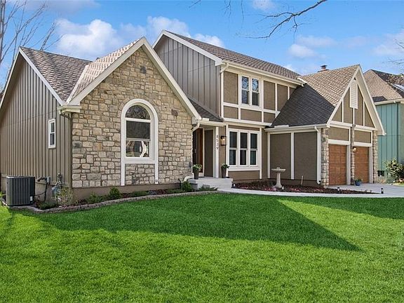 This stunning home offers incredible curb appeal and an unbeatable location, backing to a scenic walking trail. Step inside to a spacious great room with soaring beamed ceilings, creating a warm and inviting atmosphere. The main-level primary suite features a beautifully updated master bath for ultimate comfort. The large eat-in kitchen opens to a huge deck, perfect for entertaining while overlooking the expansive fenced backyard and serene green space. Additional highlights include a new HVAC system, new windows, new deck and new concrete driveway & sidewalk. Unfinished basement offers ample storage, shelving, and a workbench. Great new Lenexa Aquatic Center opening Memorial Day Weeknd! Don't miss this Oak Valley gem—schedule your showing today!