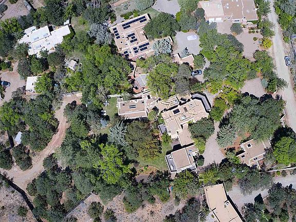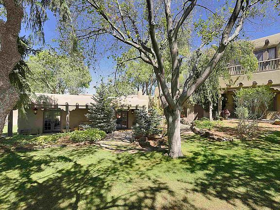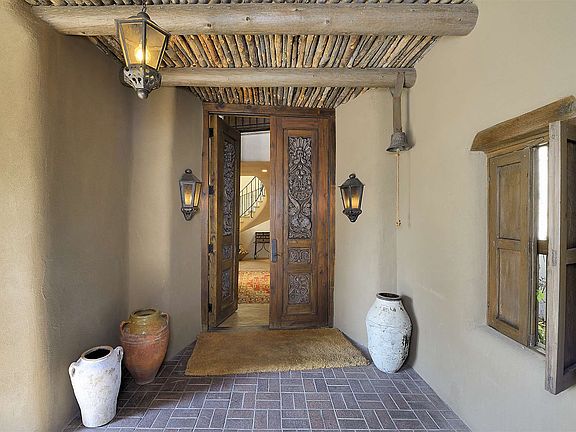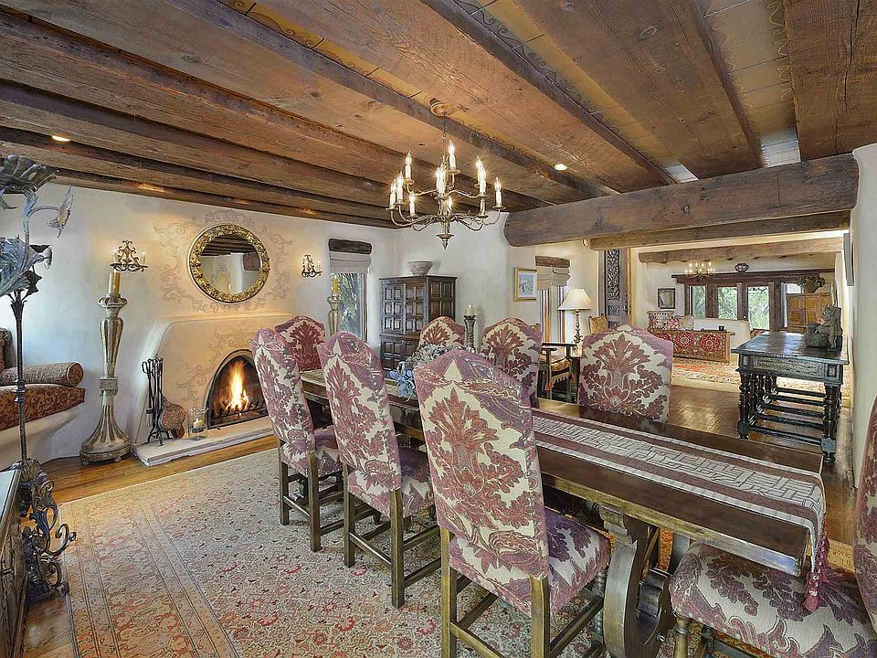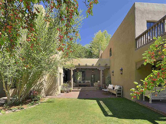This newly restored historic double-adobe home exquisitely nestled in tranquility was featured in The Secret Gardens of Santa Fe. On .763 acres in Santa Fe's Historic Eastside and only minutes away from famed Canyon Road, this quiet compound is perfect for meaningful retreats, large scale reunions, easy outdoor entertaining or sheltering in place. With 13 fireplaces, 7 bedrooms and 8.5 baths, the main house, separate guest suites, studio apartment and casita reflect extraordinary attention to detail. John Midyette, Santa Fe's preeminent architect, created what Bob Villa of the series "This Old House" called "the home with the million-dollar entrance." The Sangre de Cristo and Jemez mountains can both be seen from the balconies off the spacious upper rooms. The hand-troweled plaster and mud finish walls, antique wide plank wood floors, mesquite doors, vigas and beams compliment the hand-painted doorways and fireplaces. Classic buff-colored flagstone and brick floors. The main house includes a spacious den and chef's kitchen with Sub-Zero refrigerator, Lacanche range from France, custom cabinetry and center island with marble tops. The living room, bar, and formal dining room, with seating for 10, include kivas and outdoor portals. Large office/theater and a 1,500-bottle wine cellar. Lush fruit trees, majestic pines and aspens create a calming euphony over the carpet of Kentucky Blue grass. Casa Contenta, is a hidden, must-see rarity in Santa Fe.