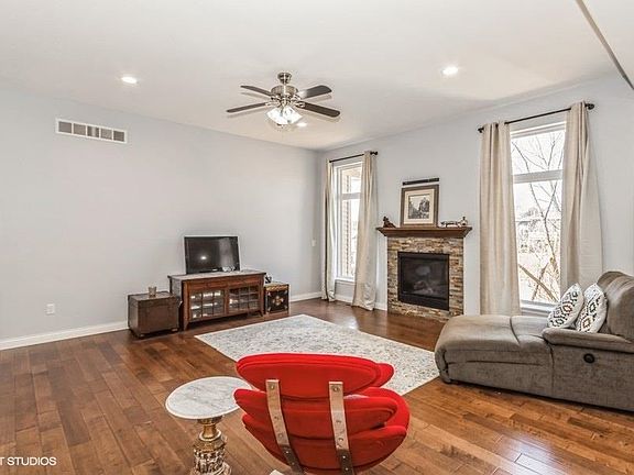 Wonderfully upgraded custom ranch plan in Cardinal Ridge. This 5 bedroom, 3.5 bath, walkout home offers an open design with tall ceilings, hardwood floors, painted trim and warm neutral tones throughout. Painted cabinets with crown molding, ample storage, drawers with solid box construction and dovetailed joints. Glass tile backsplash, granite countertops and stainless steel appliances. Large kitchen island with built in microwave and stainless sink. Walk in pantry. Main level laundry room with sink. Mudroom with locker and half bath. Gas fireplaces in both the living room and family room. Primary suite with box ceiling, private bathroom with tiled shower and separate vanities and large walk in closet. Sunny screened porch and deck. 3 stall garage has utility sink and is roughed in for electric car charging. LL with large family room, wet bar, exercise room, 2 additional bedrooms, bathroom and utility room it great storage space!