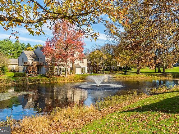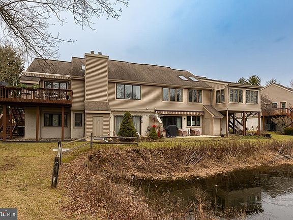 Each time you look out the windows of this spacious unit you will smile as you enjoy the view of the pond and golf course. This Upper Chalfont is a one floor end unit with easy access. The expansive Living/Dining area is flooded with sunlight from windows and skylights. The sunroom with its spectacular sunsets will become your favorite refuse all year long. There are steps to from the sunroom to the exterior. The kitchen has an abundance of counter space and includes a display cabinet for your serving pieces and glassware facing the dining area. Additional built ins for your collections line the wall of this area. The truly enormous main bedroom has two walk in closets and a large window seat. The attached bath is tastefully updated. The second bedroom currently used as a den/office has more built ins. There is another updated bathroom that can be accessed from this room or the hall featuring a barn door. This unit is close to the walking trail and pool.
