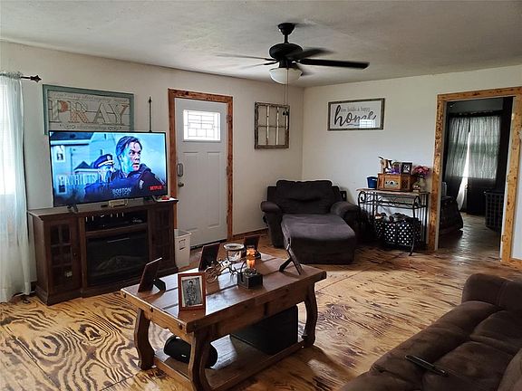 Perfect location to start your first small homestead, or to downsize to! Park like entrance to property with trees and green grass. Gravel drive leads to home (sitting BEHIND the mobile) in open area with luscious grass and new front wood deck the length of the house. Front door opens to living room with burnt finish to floors that carries through the entire house. Small dining room sitting off of galley style kitchen, with room for a small island. Lots of rustic finished cabinets in all electric kitchen that leads to the back door. 3 bedrooms with closets on the same side of the house. Spacious rustic finished bathroom with walk in shower covered in barn tin, and a closet next to shower.