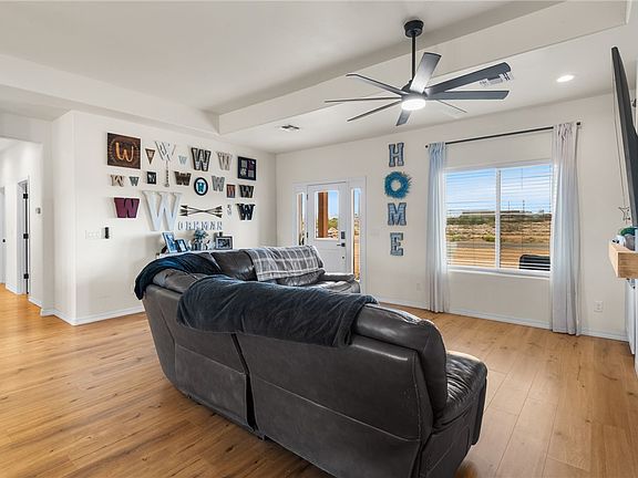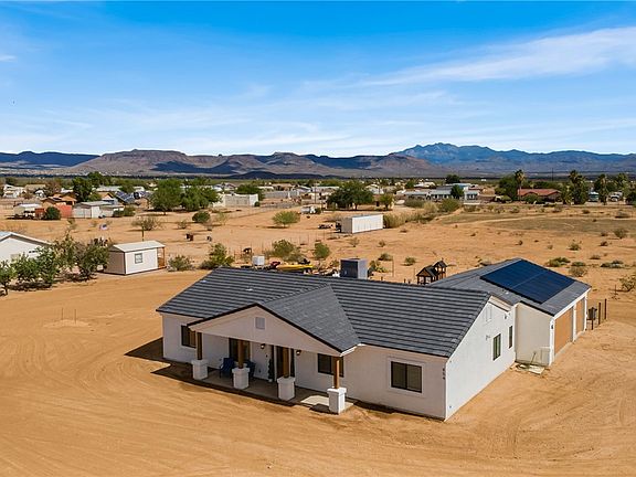 BETTER THAN NEW!! Check out this beautiful and modern Golden Valley home situated on ONE full acre! Featuring a 3-car boat-deep garage, this property offers an open and inviting floor plan with stylish upgrades throughout! Enjoy designer lighting, upgraded flooring, floating shelves, and more all thoughtfully designed to create a modern, move-in ready space. For added convenience, the north side of the home is equipped with RV electric, water, and dump hook-ups. Bonus: leased solar is already in place for energy efficiency! The spacious living room features a custom built-in entertainment wall with electric fireplace and abundant natural light! The gourmet kitchen is designed for entertaining with a large island, stainless steel appliances, quartz countertops, modern backsplash, Huge walk pantry, Indoor laundry area with extra storage space. This home offers comfort and privacy with two generously sized primary suites, each featuring its own bathroom. Ideal for multi-generational living, hosting guests, or anyone who desires added space and independence. The split floorplan places each suite on opposite sides of the home, providing maximum privacy and a thoughtful layout. Don t miss the chance to own this stylish Golden Valley home close to Kingman, Laughlin, and surrounding desert recreation