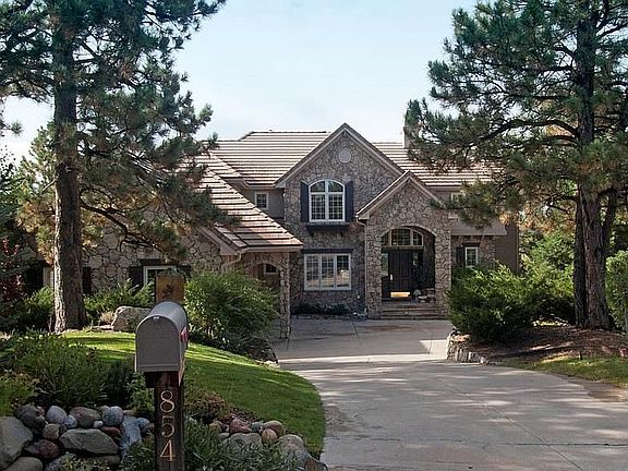 Drive up to this stunning stone faced Castle Pines Village estate. This 5 bedroom, 5 bath custom home features all of the upgrades you can imagine in over 6000 finished square feet. Step into the foyer featuring beautiful hardwood floors and neutral colors. High ceilings, arched doorways, extensive slate and hardwood flooring and custom built ins in multiple rooms create an easy living space. The great room, main living space features 2 story high ceilings with a custom fan, floor to ceiling windows for an abundance of natural light and a stunning stone fireplace wall with wood moldings and cabinetry. The kitchen is exactly what you would expect in a home of this caliber! Gorgeous slab granite counter tops, hardwood floors, high end stainless steel appliances including a 6 burner gas stove and "grecian style" columns for detail and flair. There is also a large eat in, bay window area breakfast nook. A butlers pantry leads to the large formal dining space with chandelier and wall of windows. Formal living area boasts large arched openings and cozy gas fireplace. The main floor also features a large, wood trimmed study with cross beamed ceilings, floor to ceiling wood built ins and plenty of space to get some work done!Travel up a flight of stairs to the Master suite and enjoy vaulted ceilings, another gas fireplace and custom plantation shuttered windows. The huge master ensuite also boasts vaulted ceilings, beautiful marble tiled floors, countertops, soaking tub, walk in shower and walk in closets.The finished walk out lower level of this fabulous home features a large recreational space, designated exercise room, wet bar and storage area in over 2200 square feet. Views are abundant from the main level deck which is great for entertaining or eating al fresco.