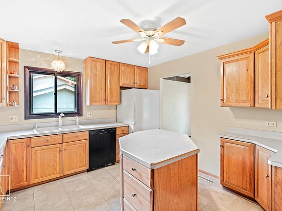 Spectacular location backing to Park. Country kitchen with upgraded hickory cabinets and center island with large dining room for entertainment. Beautifully redone lower level bathroom. Wood-burning Fireplace in large Family Room. Desirable rarely available Homestead model - impressive soaring ceilings and beams. Large laundry/utility room in lower level plus additional room that walks out to back yard, possible office, mud room, storage, craft room or workshop! Newer roof and maintenance free exterior. Mature landscaping with lots of trees. Enjoy the park views from the backyard with huge patio. Large 2 car garage. Lower level is finished w/walk out. Taxes will be lower for owner occupant. Sold AS IS.