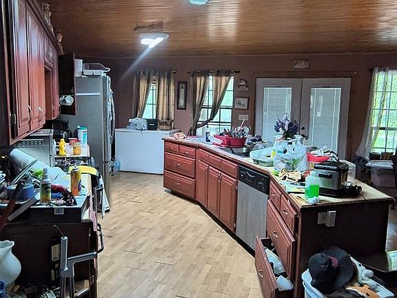 This residence features 4 spacious bedrooms and 2.5 bathrooms, providing ample room for comfortable living. The open-concept living area flows seamlessly into an open kitchen equipped with appliances, granite countertops, and ample storage. Natural light floods the space through large windows, highlighting the hardwood floors and cozy fireplace. A detached finished guest house offers a potential 4th bedroom, along with one full bathroom. The property is approximately 5.0 acres (MOL).