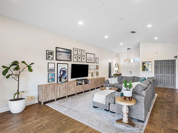 Upon entering the home, you'll be immediately captivated by the tasteful design and peaceful ambiance. The high ceilings, open concept and large sliding windows makes the home feel light, bright and airy. The spacious living area is perfect for both relaxing and entertaining, while the large impact sliders offer breathtaking views of the serene lake and sparkling pool. The kitchen includes quartz counter tops, white cabinets and Samsung appliances and beautiful tile work. The master suite offers a peaceful retreat with expansive lake views and an updated en-suite bathroom. The split floor plan has two additional bedrooms that share an updated bathroom. See more. Step outside to your oasis, where you can enjoy the Florida sunshine by the pool, or unwind on the patio overlooking the tranquil lake.
