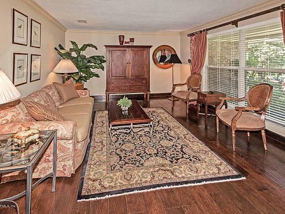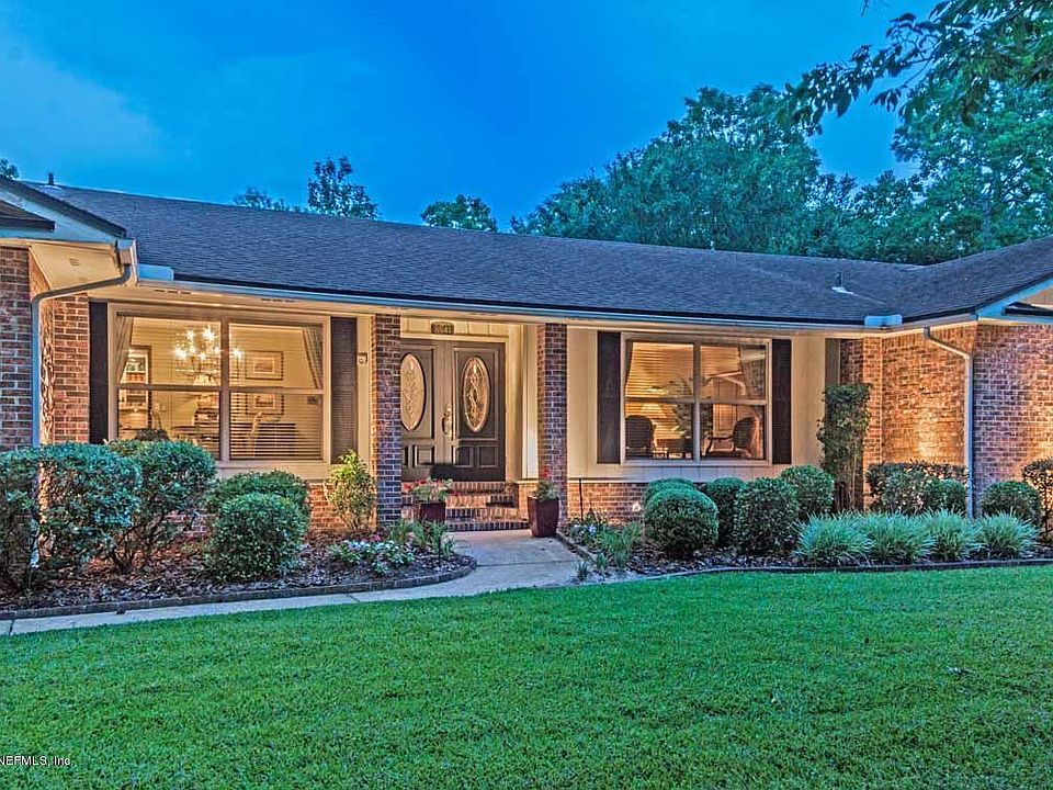 Amazing pool home on over an acre lot in Jacksonville! This sprawling brick ranch is a true family home with just under 3,000 sq ft of living space with multiple living areas that include a formal living room, dining area, family room and sunroom, plus pool and patio entertaining area, all situated on a park-like lot covered with trees and gardens. Four bedrooms and 3 full baths provide plenty of space for family and guests. Create a culinary feast in the kitchen which features white cabinets with glass-front uppers, tile backsplash, recessed lighting, farm sink and a pass-through to the Florida room, then serve it in the elegant dining room with wood floors, crown moulding and relaxing pool views. At the end of the day, retire to your stunning owners suite - a peaceful and elegant