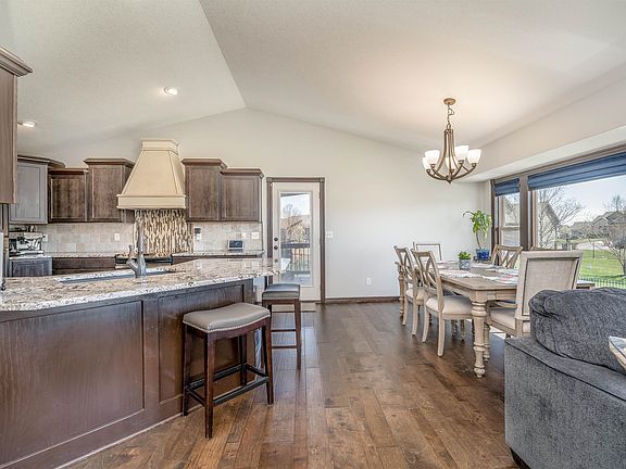 Welcome home! This amazing home features a large lake lot, a walkout basement at grade, a gorgeous .40 acre yard with sprinkler, and an irrigation well. Located within the Maize school district, this home offers three bedrooms and two baths on the main floor with engineered hardwood floors, new granite in the kitchen, a walk in pantry with motion lights, under cabinet lighting, bronze hardware, dark trim, beautiful dark cabinetry, and fresh paint. Check out the double oven in the kitchen! All appliances can be included, but kitchen refrigerator is negotiable. You will love the completely separate laundry area with built in shelving as well. Head to the basement and find a huge Rec area, a roughed in wet bar (check out rendering for ideas on how you could potentially finish in the future), two bedrooms, and a third bathroom that was completed within the last few years. There is also a storage area, white trim, and a walkout, sliding glass door that goes directly to the concrete patio in the backyard. The east facing covered deck is a dream! There is a gas line that has been ran to the backyard patio for a future fire pit, the garage has epoxy floors, and another gas line was ran for a space heater in the garage. Garage also has insulated garage doors! Details were just not missed - the custom front door has a new adjustable glass storm door with screen, exterior of the home was painted within the last few years, there basketball goal out front, a humidifier on the furnace, and so much more! Don’t miss out!