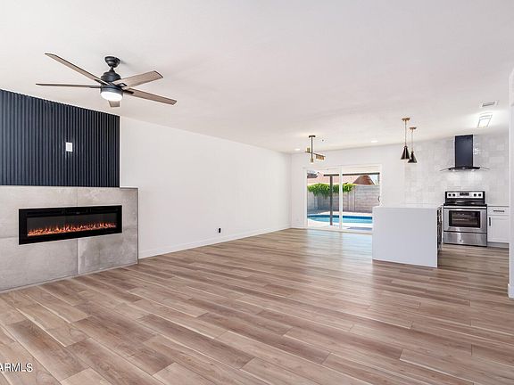 Great Location! A stunning and completely renovated home boasts an open floorplan with 3 bed, 2 bath 1260 sqft, 1 car garage, covered patio, and pool. The kitchen comes with stainless-steel appliances, quartz countertops and brand-new white shaker cabinets. Brand new vinyl wood flooring and carpet throughout the home. Enjoy the fully upgraded, spa like bathrooms with high end shower system, framed mirrors, shower niche, and custom vanities. An elegantly decorated floor to ceiling tile fireplace to enjoy on those cold cozy nights. Sparkling pool with easy to maintain landscaping creates a perfect outdoor oasis. Brand new sewer system and solar panels owned free and clear!! Situated in the heart of Scottsdale and just minutes from great restaurants, the entertainment, shopping and