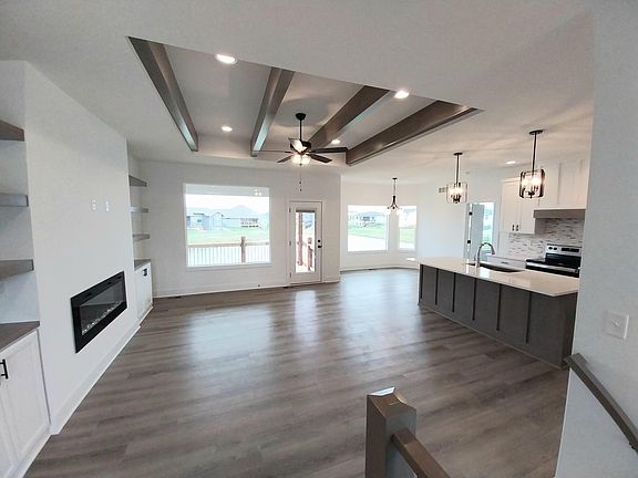 Functional and practical split bedroom home. 5 bedroom, 3 bath 3 car garage with open kitchen, living dining combo! Kitchen Island overlooks dining and living space with plenty of space to entertain. Kitchen features a walk-in pantry with plenty of storage and space to move around while cooking. Living room features access to covered deck overlooking back yard. Both kids rooms are on the other side of home. Master bedroom overlooks back yard with custom ceiling feature. Master bath has large shower with his and her vanities with nice size walk-in closet. Basement is finished with a 30 foot family room, 2 more bedrooms and a bathroom. Home is new construction and taxes have not been levied yet, you must call county to get accurate property tax info. This is a model home and is available for move in February, 2024. All information deemed reliable, but not guaranteed.