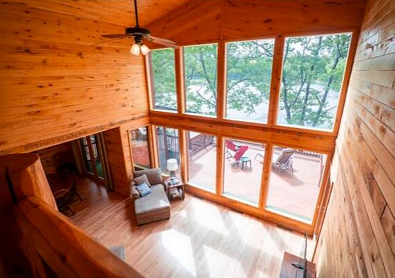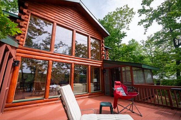 Imagine life in a five bedroom, 3 1⁄2 bath, log-sided home with 100 feet of sandy beach frontage on pristine, spring-fed, secluded, no-wake Eagle Lake, adjacent to hiking, biking, snowmobile, and ATV trails. Imagine the unparalleled view from your loft or eight main floor great room windows or from your expansive 300 square foot deck with two 12x12 covered porches on either side that capture only the serene lake and the densely wooded state-land hills. Features include an attached two-car garage with 8-foot door and a 12x24 heated workshop, newly sand blasted and stained log siding, shingled roof, quartz countertops, and sanded and stained oak floors in master bedroom, great room, and dining room.