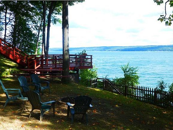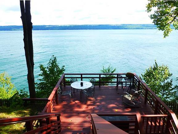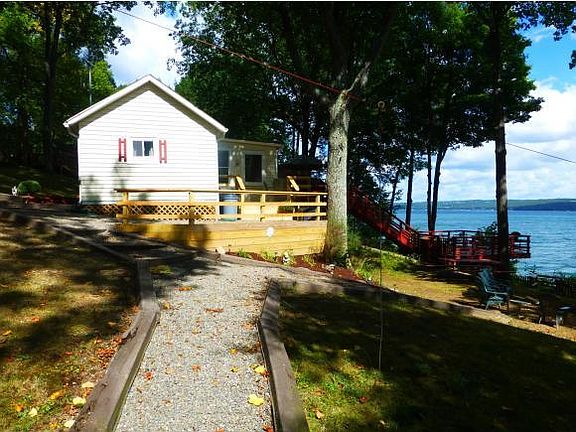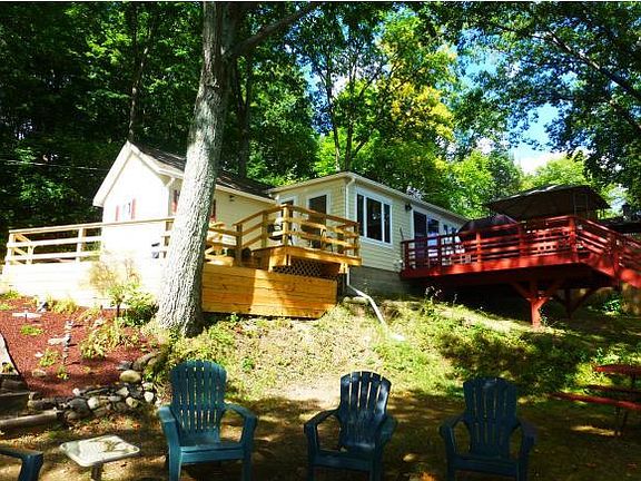 Fantastic large lakefront parcel with a great cottage, all lovingly improved over 16 years! Begin with 125a lakefront, gorgeous views, two 16x16 decks w/ample seating , plus a lake-level third deck with dock, boat hoist, and steps to beach! The transformed cottage is a gem, with 3 usable bedrooms (plus bunkhouse), remodeled kitchen & bath, new family room, and living room with awesome views a all in move-in condition! Gas fireplace and AC extend the season. Lots of parking for sharing with friends and family.