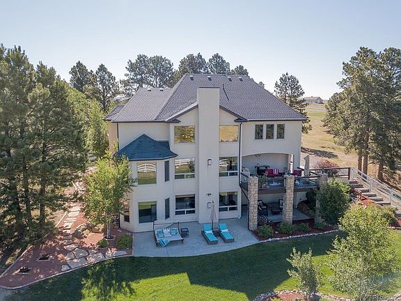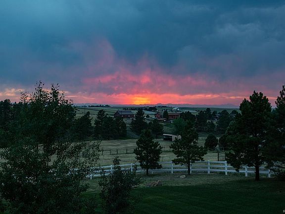 UNIQUE STORYBOOK BEAUTY! 14.6 scenic acres of gently rolling meadows w/lovely trees! Stylish quality, luxury craftsmanship &attention to detail. Grand vaulted foyer,hand hewn walnut floors,high-end tile,rustic oil-rubbed bronze lighting,8ft doors,wrought-iron stairs,2story rock fireplace,new carpet*Cathedral ceilings/picture windows frame views of wildlife,meadows,mountains,trees & glorious Colorado hot pink/orange sunsets like artwork*Gourmet kitchen w/exquisite crystal granite,Alder cabs,Chef's appliances, rock gas stove w/water*Handsome study*Stately dining*Butlers pntry/wet-bar*Huge master w/5piece bath,sleek tile, jettub,steam shower&walk-ins*Kidsuites w/baths*Walkout w/media-rm, guestsuite,rec room w/fireplace!Relax on multi-level outdoor living w/gas grill,overlooks meticulously landscaped fully fenced grounds &serene waterfall! 2stall barn w/runs,auto-water,tackrm*3car att garage*Plus amazing shop for car collection, boats, rv,trailers,tractors! RV hookup &storage barn/carport.