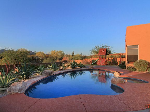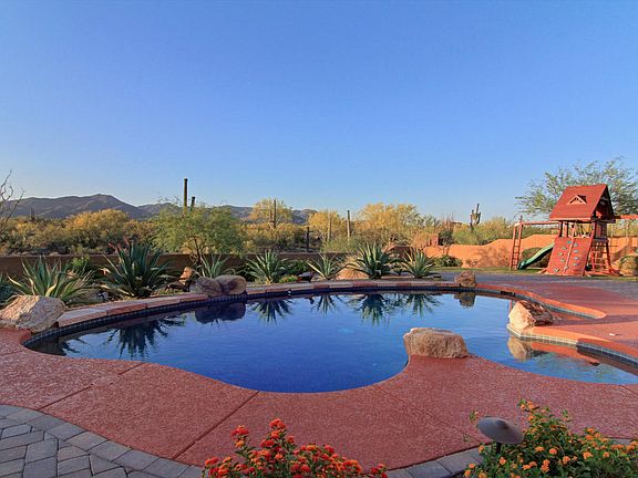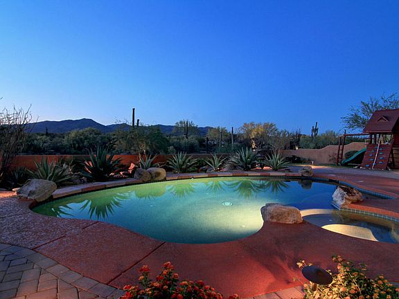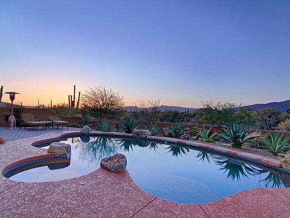 Former Model home with amazing views. Beautiful semi custom home with 4 bedrooms plus office with custom built in wall unit/desk and 3.5 baths. Gorgeous upgrades throughout with slate floors, granite, shutters, blinds, drapes, custom paint. two gas fireplaces, sunscreens, ceiling fans, surround sound, solid wood doors. Large family room, living room, dining room and eat in kitchen with upgraded cabinets, granite counters, large island and breakfast bar, walk in pantry, RO, gas stub for stove, wet bar, large laundry room with cabinets/sink, water softener. Master suite with sitting room, custom bath w/dual vanities, bidet, large closet.Peaceful backyard with covered patio, heated pool/spa, brick pavers, cool deck, grass,grill and fire pit to watch the beautiful sunsets and for entertaining