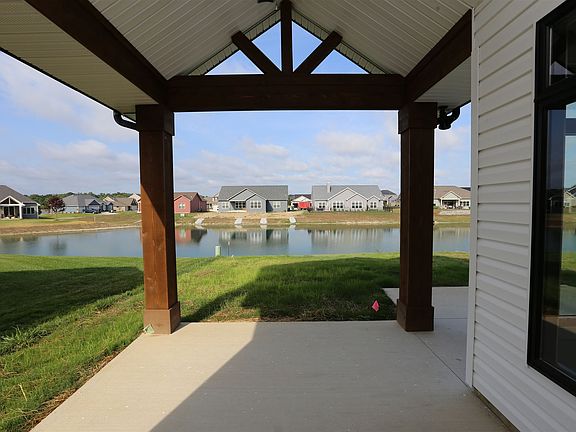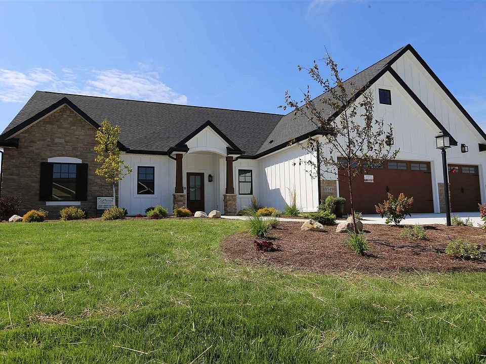 Home is in the Builders Showcase Sept 23-27 and is available the first week of October. Stunning new modern farmhouse villa home by Granite Ridge Builders. This spacious, split bedroom plan is situated on a beautiful pond. Charming curb appeal welcomes you in to this well thought out floorplan. The entry welcomes you with shiplap. The great room has a corner gas fireplace with stone surround and barn beam mantel. A delightful custom kitchen offers maple painted cabinetry with and island, quartz countertops, tile backspash, specialty pantry door and extra cabinetry details. Both the nook and the sunroom offer plenty of natural light with large windows. A covered veranda is a great addition to this home. A private entry welcomes you to the master bedroom complete with a stunning accent wall, 2 closet and a large bathroom. The master bathroom is detailed with a herringbone pattern tile, separate stool room, 8x4 porcelain tile shower and wider vanity with cabinet linen closet. Other features of this home are: large laundry room with cabinetry, half bath, utility tub in garage, 24' deep garage with 815 SF and yard irrigation. ***Front of the home will be painted weather permitting.