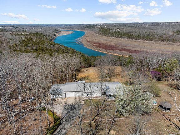 This is a rare opportunity to own over 6 acres of unrestricted lakefront property on the shores of Bull Shoals Lake! Located just 12 minutes from Branson Landing, you'll enjoy the peacefulness of this tranquil area while being close to the best local amenities, including world-class trout fishing on Lake Taneycomo, live entertainment in Branson, world-class golf courses, Bull Shoals and Table Rock Lakes, Skaggs Hospital, and a free college, the College of the Ozarks. Be sure to ask about an assumable interest rate on the majority of the loan!The home itself is a beautiful, well-maintained 3-bedroom, 3-bathroom, 3-car garage property. With sweeping views of Bull Shoals Lake, this home is a true retreat, featuring a spacious deck that extends the length of the house. The property also features a wet-weather creek, direct access to the lake, and Johnson's Bluff. Wildlife lovers will appreciate the abundant deer and turkey--ask about how to receive 7 additional deer tags! And what other place can you hunt right from your bedroom window?!Inside, the home features stunning wood beams, flooring, and a stone fireplace surrounded by custom wooden bookcases. The kitchen is outfitted with ample wood cabinetry, stainless steel appliances, and a pantry. The property also includes a finished half bath in the third garage, which could be converted into an additional apartment, rentable living space, or a shop with a 220 plug already installed.The property offers plenty of space for parking an RV, boat, or other recreational vehicles. It also operates efficiently with propane, septic, and public water, and has a 50-amp plug outside for campers. Recent updates include a cleaned water softener, an updated air conditioning system, and recent inspections and maintenance on the chimney, and and septic tank.This property offers it all. Don't miss your chance to own this stunning, unrestricted lakefront property!