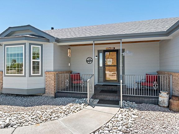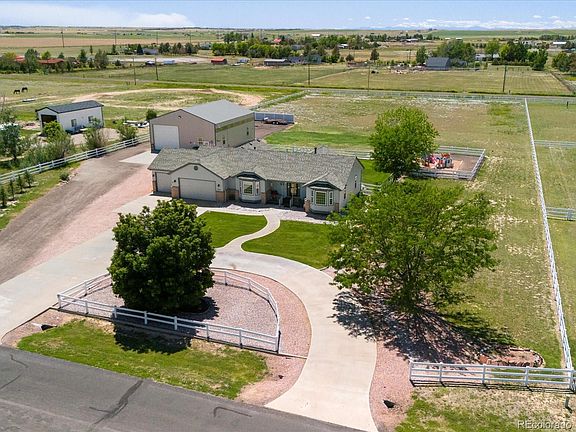 Escape to the expansive openness of Strasburg with this impressive 6-bedroom, 3-bathroom home situated on a fully-fenced 2.5-acre lot, offering breathtaking west-facing mountain views and a versatile ~40x60 outbuilding! This property seamlessly blends rural charm with modern sophistication—don’t miss the opportunity to call it home. As you approach the front door, you'll be welcomed by the inviting covered front porch, perfect for relaxing and enjoying the sunrises each morning. Upon entering, you'll discover a sprawling open floor plan featuring an extra-large living area that connects directly to the kitchen and formal dining room. The living room features a cozy fireplace, while the kitchen boasts granite countertops, a pantry, ample cabinet space, and an eat-in area. The ideal layout of this home provides separation between the primary suite and two additional upstairs bedrooms and hall bath. The spacious primary suite boasts west-facing windows, a luxurious 5-piece bathroom with a tub, shower with seat, a large walk-in closet, and a separate toilet room. The basement includes an expansive bonus/living room, three additional bedrooms with egress windows, a 3/4 bath, and multiple storage rooms. Outside, you'll appreciate the circular driveway, multiple parking areas, an oversized 3-car garage, fully vinyl-fenced lot with a separate playground area, beautiful landscaping, and a private covered patio with stunning views of the Rocky Mountains. Plus plenty of room to bring your ATVs and/or horses! The outbuilding is perfect for all your recreational toys and workshop needs, featuring a partially finished room, 1/2 bath, RV parking and hookups, and a second level for additional storage. Experience the tranquility and privacy of country living while being just a short drive from local shopping, dining, and schools. This welcoming rural setting provides ample space for all your outdoor activities and offers easy access to I-70, without the noise of the highway!