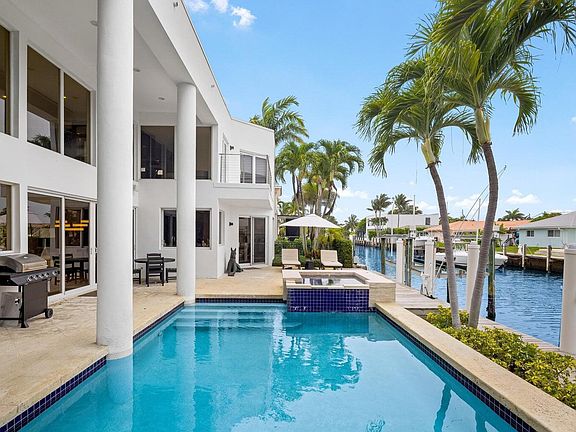 Experience the pinnacle of South Florida living in this fully furnished, turnkey modern estate located just two lots from the point on a deep-water canal with 85 feet of dockage perfect for boating enthusiasts with direct Intracoastal and ocean access. This two-story residence showcases striking architectural lines, dramatic columns, and expansive glass walls that flood the interiors with natural light. Inside, enjoy soaring ceilings, designer lighting, curated furnishings, and an open-concept layout that seamlessly integrates formal living, dining, and entertaining spaces. A floating staircase and glass-enclosed loft areas enhance the homes sense of scale and modern elegance.