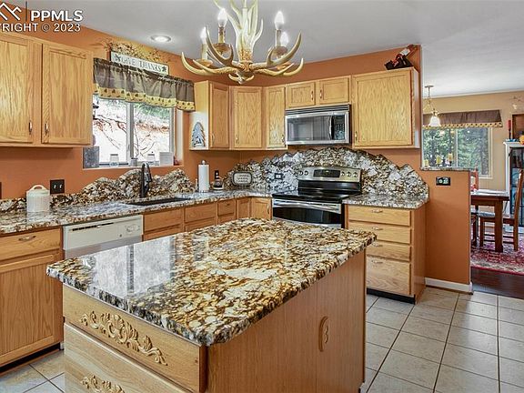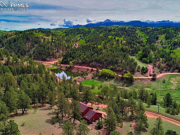 Beautiful log sided two story home on over 4 fantastic acres. This home is in great condition and is in move in ready. Mature ponderosa pines on the lot, views of Pikes Peak and Mt Pisgah. This lot is incredibly private and has a wonderful mountain feel to it. New granite countertops & granite backsplash in the kitchen with ceramic tile flooring. Appliances are newer and there is excellent cabinet storage. In the family room there is T&G Aspen ceilings, high end enamel pellet stove & a new glass sliding door leading to the outdoor dining area. Breakfast nook area located between the kitchen and family room, in addition to a large formal dining room that will accommodate an oversized table for seating of 10. Living room is very comfortable and has a expansive picture window framing the mountains. Main level powder room is centrally positioned completing this level. Three bedrooms are located on the upper level, with a nice sized owners suite with a private attached full bath & walk-in closet. Master also has a new glass slider to a private balcony overlooking wonderful views of the mountains & is a great place to enjoy morning coffee. Bedrooms 2 & 3 are nicely appointed and have double closet doors for extra storage. Upper level full bathroom has Corian counter tops & newer tile surround in the tub & shower area. Laundry area is also conveniently located on the upper level nearby the bedrooms. New roof was installed in 2018. Home also includes a two car garage & a storage shed. A full sized crawl space for lots of storage. Nicely situated sitting area behind the home to enjoy the great views. Only 7/10 mile away from pavement, and all County maintained roads. Central water system in the neighborhood through Mountain Mutual Water. Community benefits include a clubhouse, with an indoor pool & exercise room. Two separate lots in total. Located only 10 minutes from downtown Cripple Creek. This home is all about what mountain living should be!!