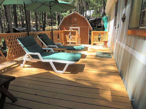 This is a well-maintained, sunny, and very comfortable 2 bedroom 2 bath home manufactured home with deck and small, well built, fully wired 10' x 12' "barn" and workshop outbuildings. The home is very clean with newer carpet and vinyl. No smokers ever. Situated in a peaceful and serene setting adjacent to an 85 acre forested parcel. It's a quarter mile from the Shasta Trinity National Forest boundary with nearby spectacular views of the Trinity Alps and four miles from the Long Canyon trailhead providing easy access to the trails of the Trinity Alps Wilderness Area. The home is move-in ready. Fully furnished with refrigerator, washer/dryer, dishwasher, microwave, and two window box air conditioners. Living room, dining room and bedroom furniture come with house should buyer desire furnishings. Also, deck furniture. It has a fully equipped kitchen. Heating is a forced air propane furnace.100 pound metal snow roof over a composite roof. Windows are double panes. The home is very well insulated with 6 inches insulation in the ceiling for year-round comfort. We have great water from a community water system which has two deep wells run by Covington Mill Water Boar. Sold AS IS
