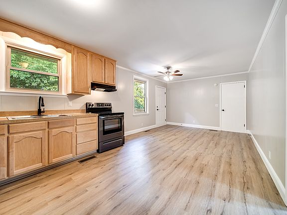 Remodeled with laminate flooring throughout, newer roof, replacement windows, kitchen appliances, and cabinets. Laundry area has cabinets and washer and dryer can stay as-is. Concrete drive and fence. Shaded, deep backyard that backs up to the Greenway. Storage building.