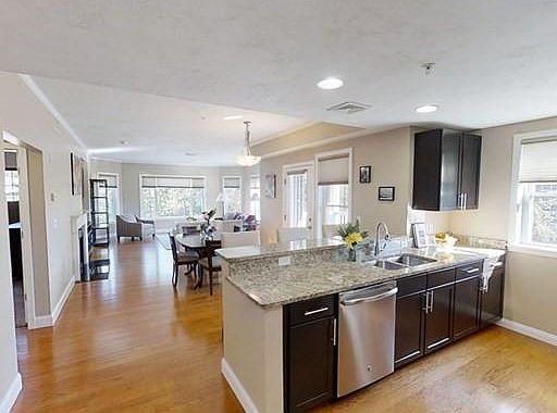 This fantastic, light-filled Corner unit has spacious open concept. Hunter Douglas window blinds throughout. Unit contains 2 Bedrooms, located opposite sides of unit, 2 Full baths, Kitchen has peninsula & matching Stainless Steel Appliances. Granite countertops with Contemporary Cabinets and finishes. The gas fireplace lends a cozy feel to the open concept Dining/Living room area. Off the Dining room, door leads to an Oversized & Covered Deck where you will enjoy outside private space for morning coffee and more. Master bedroom, custom room darkening shades, Master bath has subway tiled shower/tub and is spacious. Professionally organized closet system in both bedrooms. In-Unit Laundry closet contains large stackable Washer/Dryer. The Unit has 2 deeded parking spaces - 1 underground heated garage spaces plus 1 outside near Front Entrance of building. Also includes oversized storage easy access. Clubhouse with patio is another great feature & so much more...