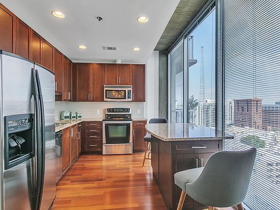Beautiful 18th floor views! You do not want to miss this fabulous 1 bed 1 bath with approx $50,000 in renovations! Fully enclosed Bedroom with modern barn door, and extra wall space. Master closet floor to ceiling wall to wall built-in cabinets. Custom coat closet, true laundry room with extra storage. New window treatments, real hardwood floors throughout. Entry foyer with office nook. Open living room with mobile floating island. 180 degree views of Midtown. 5-STAR amenties include fitness, pool, cabana grilling areas, clubroom, outdoor fireplace with lounge and garden area plus a Theater room and 24 hour concierge. Conventional, VA & FHA Spot Approval Financing Available in Building.