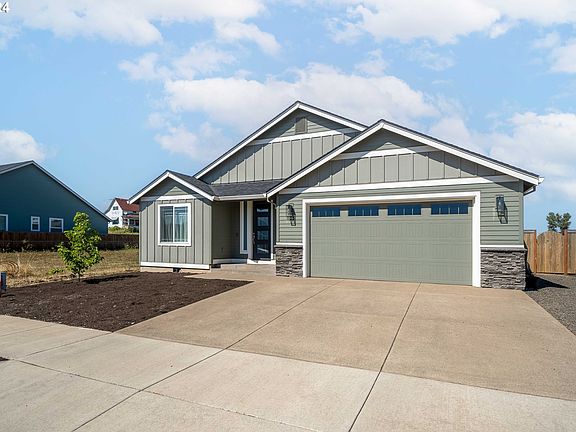 This move-in ready, single-level home offers comfort and style throughout. The open-concept great room features a cozy gas fireplace, a generous dining area, and a stunning white kitchen complete with black countertops, stainless steel appliances, a farmhouse sink, whole-house water filtration system, and a pantry. The laundry room, conveniently located off the garage, includes a utility sink for added convenience. The primary bedroom shows off vaulted ceilings, a walk-in closet, and an ensuite bathroom with a tiled shower and dual sinks. Additional highlights include central AC and a covered backyard patio, perfect for entertaining. With easy access to Ebner Park and downtown events, this home is perfectly situated for an active lifestyle.