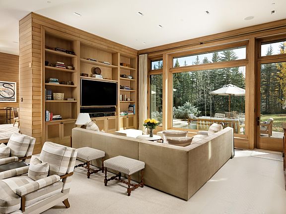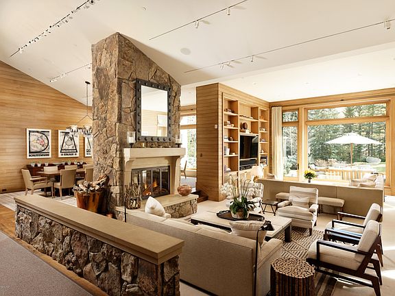 This thoughtfully designed home is nestled in one of Aspen's most exclusive enclaves. Designed with privacy, entertaining and gracious living in mind, enjoy the beautifully landscaped grounds that include a large outdoor patio, hot tub, manicured lawn, and mature gardens with a pond and waterfall - this home has it all.Greeted by an elegant foyer, you enter the vaulted ceiling living room with floor to ceiling windows. Comfortably utilize the seating areas, one centered around the double sided fireplace, and the other around a 72'' television screen. A full wet bar is conveniently placed for drinks and snacks, with a table for cards or putting your puzzle together by the fire.