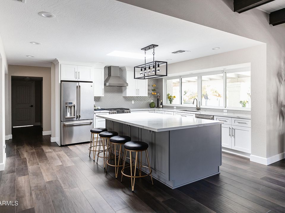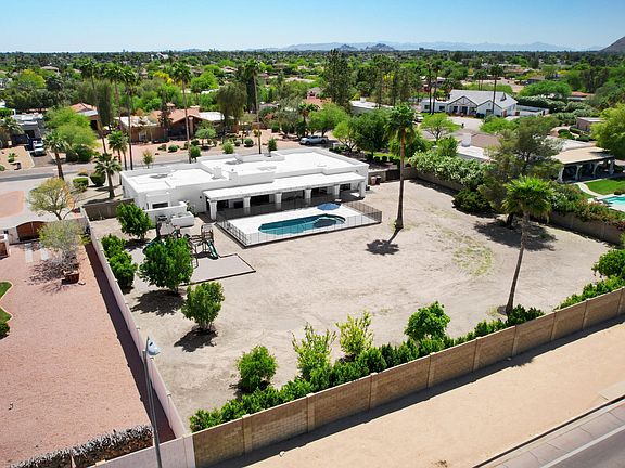 An immaculate and gorgeous ranch home that comes with over 38,000 sq ft lot with no HOA in central Scottsdale! The interior boasts skylights, rich ceiling beams and floors, a white kitchen with elegant finishes, gas stove, serving window and island with built-in bread warmer and microwave. The guest or 'granny en-suite' bedroom has its own private backyard entrance, bathroom and closet. The primary bedroom is oversized with a fireplace, backyard access, and stunning en-suite bathroom with luxurious soaking tub, double sinks, separate tiled shower and dream closet. You'll find 4 bedrooms, 3.5 bathrooms, 2 fireplaces, 2 living areas, an open concept formal dining, plus enlarged 3 car garage. Heated pool and playground but the opportunity to create future resort backyard oasis of your dreams!