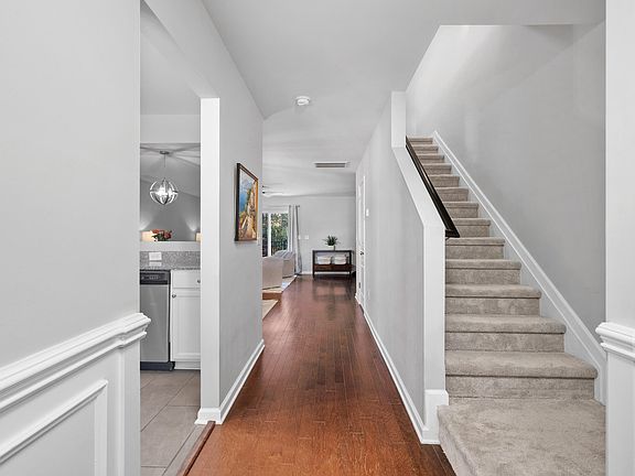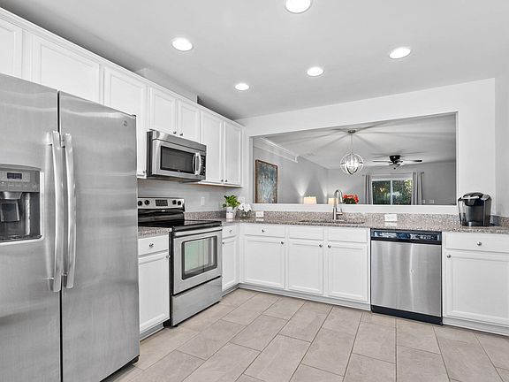 Come see this updated 3bdrm end unit charmer with renovated Kitchen & Baths! White cabinets in sunny kitchen with new tile floors, granite counters, stainless appliances, new faucet & disposal. Open first floor offers classy dining area with custom trim work and large family room with sliders to the fenced back porch with wooded view. 1/2 bath w/new tile floors & vanity & toilet. Primary & 2nd full bath also updated with painted vanity in cobalt blue + new lights & tiled floors & toilets . New Carrier HVAC 2023. Top notch amenities include pool, clubhouse, tennis, pickleball, soccer park, playgrounds. Walk to shopping & restaurants.