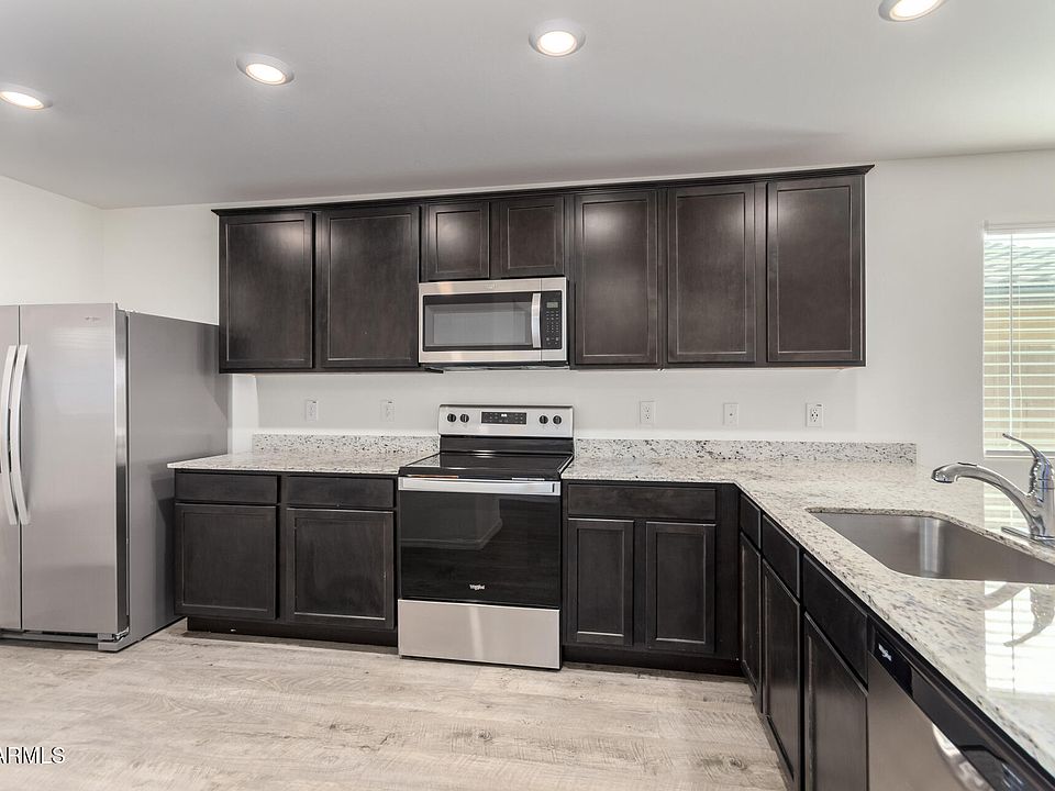 Discover the charm of this 3 bed, 2 bath single-level home in Terravista! Starting with a 2-car garage, a low-care front yard, and a cozy front porch. Just off the front entry is the formal dining room! Continue onto the impressive kitchen that boasts SS appliances, granite counters, espresso cabinetry, a pantry, and recessed lighting. Its peninsula, with a breakfast bar, overlooks the welcoming living area, creating a great room effect. Sliding doors to the back! Natural light filled the inviting interior, complemented by a neutral palette and wood-look flooring w/plush carpet in all the right places. The primary bedroom has an ensuite with a walk-in closet. Out the back, you have a covered patio to relax or enjoy BBQ. NO neighbors behind, adding extra privacy! This gem won't disappoint!