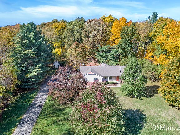 This is a beautiful location! The ranch home is nestled atop a hill in the woods with a sprawling front yard. This property is located within the Caledonia school district. New paint throughout most of house and new flooring in parts of the main level. Enjoy a spacious 4 season porch overlooking an in-ground swimming pool. From there you can wander to a living room with a vaulted ceiling and gas fireplace to warm up by. Three bedrooms, 2 full baths, and a large finished rec room in the basement! Top it all off, there is a 2 stall detached garage which is set up with natural gas, ready to be heated and enjoyed! This is a great place for your workshop! Please come see this home for yourself!