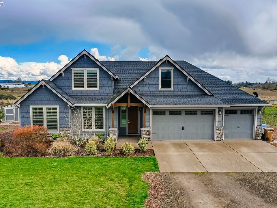 Near-new great room design on all-useable 2 acres, super-convenient to town and Hwy 26! Beautiful open design w/high ceilings, large rooms, extensive hardwoods. Big island kitchen w/quartz counters, walk-in pantry, SS appliances incl 5-burner gas range, double convection ovens, refrig. Deluxe MBR w/XLG organizer walk-in closet, tiled floor, tiled soak tub & lg tiled shower, skylight. 3-car gar, heat pump. Big covered patio, fruit/nut trees, raised beds, greenhouse & Tuff Shed, pavers, fire pit.