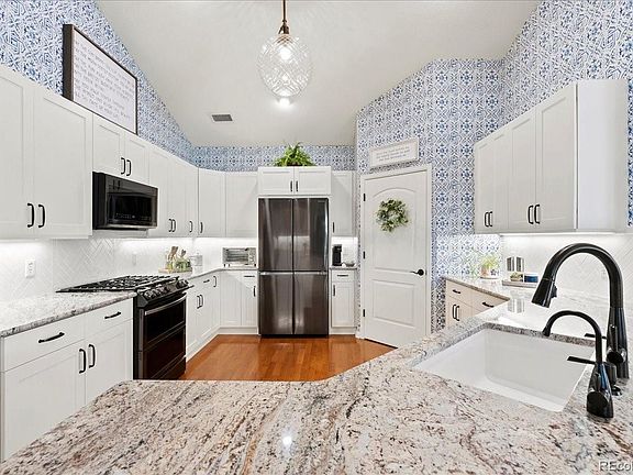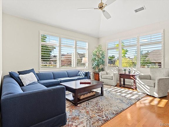 Absolutely stunning turn key 3-bedroom and office (2,456 sf) end unit in Gold Peak, this home glistens with luxurious upgrades throughout. The location within the complex is exceptional, southern exposure, very bright and sunny, quiet location with large yard surrounding and parking area for many guests. Entire home has been remodeled, gorgeous top of the line Kohler walk-in jetted tub in main bath, all new windows with Hunter Douglas plantation shutters. Master suite is luxurious with access to front porch, fireplace, large bathroom with walk-in shower and custom enlarged walk-in closet. Granite counters throughout, all new kitchen appliances. Garage is fully finished with high end finish on concrete and shelving surrounding the entire garage. All appliances stay to include washer, dryer as well as freezer and refrigerator in garage. Home has been meticulously maintained. This gated community has a feel of a private country club, residents can access state-of-the-art fitness club, cafe in club house open for breakfast/lunch/dinner, pool, multiple hot tubs throughout community, indoor basketball court, tennis and pickleball courts, baseball diamond, volleyball courts, children’s play area, racquetball court, high-impact training room, horseshoe pits, putting green and frisbee golf course. And not to mention the gorgeous park in the center of community to walk or ride your bike. Conveniently located to Park Meadows Shopping Center, great restaurants, close to medical care, borders The Links golf course. Minutes away to C-470 and I-25.