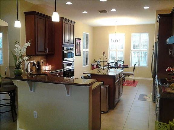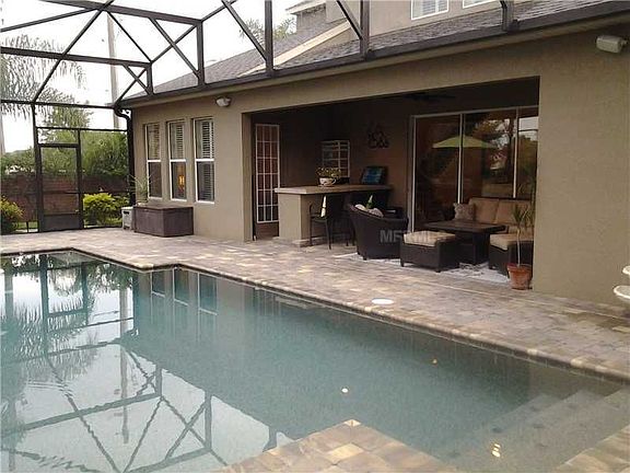 Why wait to build when you can close quickly on this beautiful four Bedroom Pool home? Tons of curb appeal with - mature landscaping, brick paver driveway, open-air covered front porch and no rear neighbors. Wonderful space in the gourmet Kitchen featuring double oven, electric cook-top, Granite counters with back splash, stainless steel appliances, 42 inch cabinets with under counter lighting, dry-bar with wine fridge. Kitchen allows for optional eating at the island, breakfast nook or breakfast bar. Formal Dining room features ample space with upgraded tile, crown molding and built-in recessed lighting outlining the tray ceiling. Great room boasts of over 20 foot high ceiling and access to Pool through the triple sliding glass doors. First floor owner's Bedroom includes wood flooring and tray ceiling. Owner's suite features dual sinks, garden tub with separate shower and large walk-in closet with built-ins. Open staircase leads to the three upstairs spacious Bedrooms with walk-in closets. Wonderful outdoor living space where you'll enjoy the salt water Pool with screened and covered sitting area and Summer Kitchen. Additional covered built-in bar-b-que and intimate fire-pit areas. Lots of space in the three car tandem style garage.