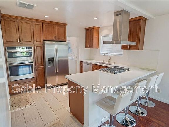 Welcome to 8555 Nestle Ave, a beautifully updated 3-bedroom, 2-bathroom home in the heart of Northridge, CA. Spanning 1,692 square feet, this charming residence combines modern amenities with classic features, making it perfect for comfortable living. As you enter, you'll be greeted by an open living area with rich hardwood floors and recessed lighting, setting a warm and inviting tone. The living room features a cozy fireplace with a stunning stone surround, ideal for relaxing evenings. Adjacent is a spacious dining area that flows seamlessly into the kitchen, equipped with sleek stainless steel appliances, custom cabinetry, and a large island with seating, perfect for casual dining or entertaining guests. The bedrooms are generously sized, with the primary bedroom offering ample natural light, a ceiling fan, and an en-suite bathroom. The bathrooms are tastefully designed with modern fixtures, providing a spa-like experience. Step outside to enjoy a private, low-maintenance backyard, fruit trees, perfect for outdoor dining or simply unwinding. Additional features include a laundry area, central air conditioning, and ample storage throughout the home. Situated in a peaceful neighborhood, this home is close to schools, shopping, Csun College and dining options. Don't miss out on this wonderful opportunity! **Landlord and/or agent/property manager makes no representation as to room size, lot size, permits, etc. Tenant to verify with appropriate entities and satisfy self. All information is to the best of the landlord and agent/property managers knowledge.**
