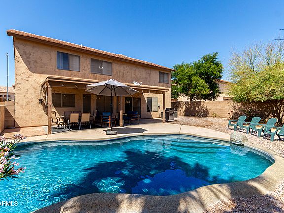 Step outside to your private backyard oasis perfect for Arizona summers with a PebbleTec pool featuring a waterfall, a covered patio, and a double gate for easy rear yard access. There are sunshades for the windows. The garage features a large storage area.