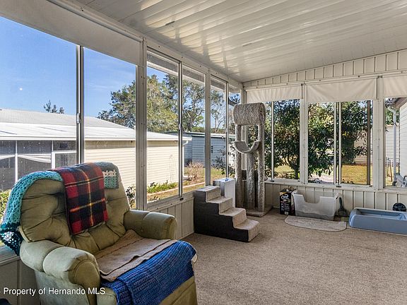 IMPECCABLY MAINTAINED AND UPDATED 2BR/2BA HOME with spacious open floor plan, bright and cheerful color scheme throughout and high-end wide plank vinyl flooring in living room, family room, kitchen, master bedroom and 2nd bathroom (w/new sub-flooring throughout)!! Master bath was also fully remodeled and now handicapped accessible; 2nd bath was enlarged and completely remodeled at the end 2022. This home is ready to provide it's new owner with lots of room for relaxation, entertaining opportunities, room for hobbies and so much more. From the inviting and nicely landscaped front yard with charming curb appeal, to the covered front porch and the large enclosed lanai there's plenty of room to enjoy those gorgeous Florida breezes. Indoors, you can invite your friends for a tasty home-cooked meal prepared by your loving chef in the huge kitchen with tons of cabinets and counter space including a very useful center island with cooktop and breakfast bar. An excellent gathering area while you eagerly wait for those morsels of goodness. In the meantime, want to keep busy? The workshop and storage areas are abundant for all of your arts, crafts, tools and toys; plus you have even more room under the oversized carport for other odds and ends. With formal living, dining and family rooms spaces you can easily spread out and relax when you're ready to end the day indoors. The bedrooms are of a good size and bathrooms are nicely updated - over all this home is STUNNING AND MOVE-IN READY!!! A few more updates and features are: In-window Hurricane Shutters on most windows; New drywall in most of the home; Newer Air-conditioning unit; Newer Roof Sealant; Front Load Washer & Dryer on pedestals in 2020; Barn-door installed in Master Bedroom. All this and located in sought-after Brookridge (GATED 55+ community) where you OWN YOUR OWN LAND and enjoy amenities like heated pool, tennis, golf course, shuffleboard, community center and lots more! CALL NOW TO SCHEDULE YOUR SHOWING... AND MAKE AN OFFER TODAY!