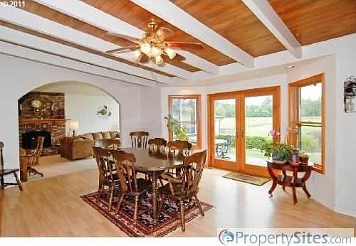 Gorgeous remodeled 1955 one level farmhouse. Tons of light, large eat-in kitchen, formal dining,Open beam tongue & groove wood ceilings, french doors to backyard, huge family room w/ pellet stove, 20+ ft vaulted ceiling and amazing views. Beautiful flat acreage at the base of Mt Pisgah. Cross fenced with barn and detached 3-4 car garage. Quiet dead end Street.