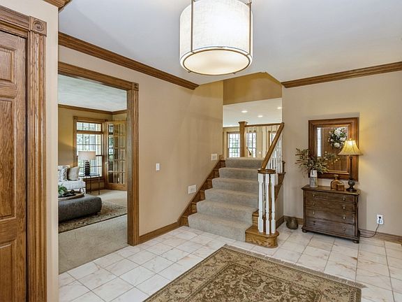 The oversized four-stall garage is heated and features a large floor drain. It has direct access to the lower level and leads into the mud/hobby room.